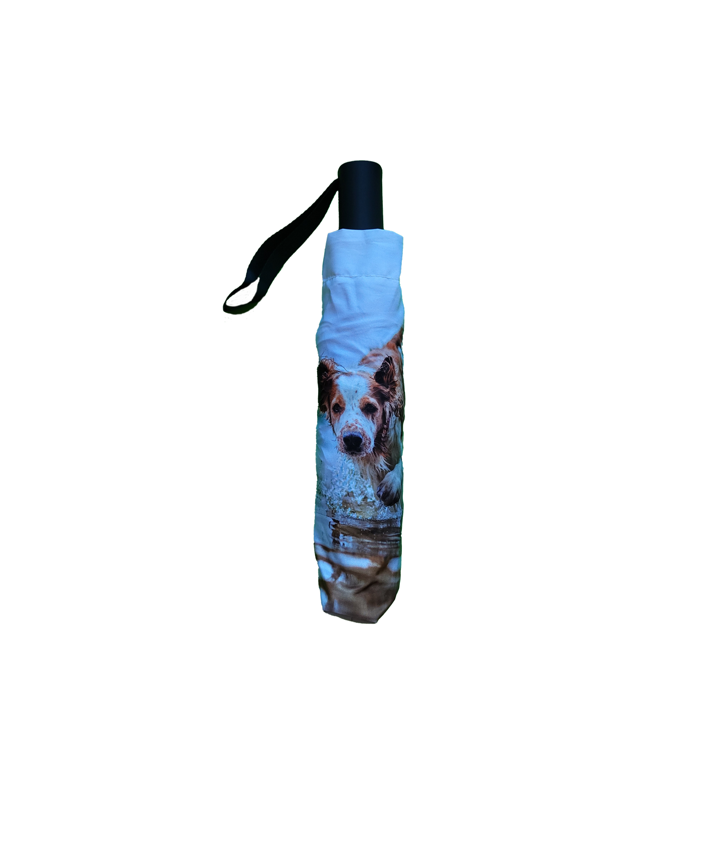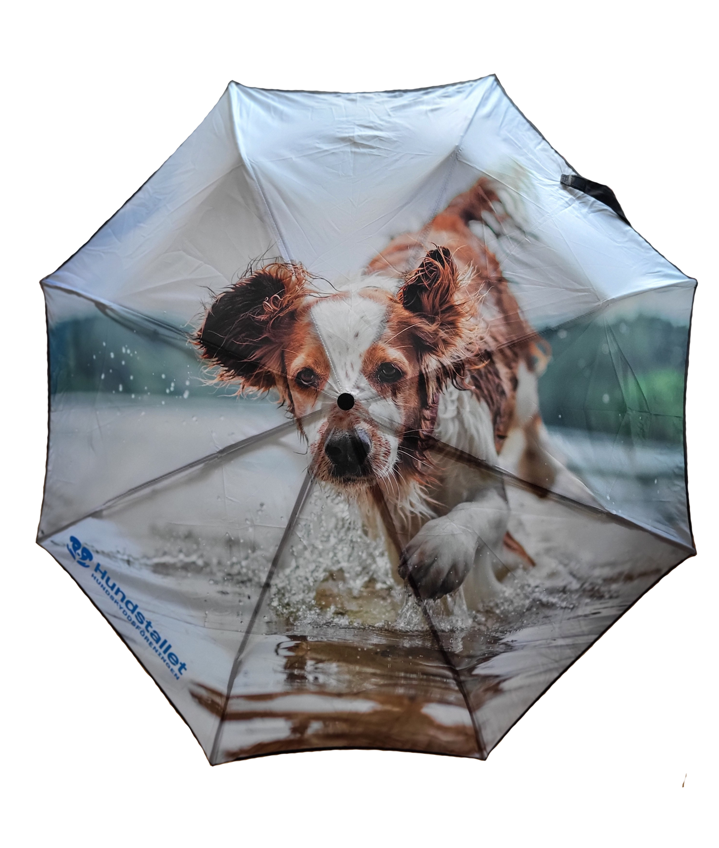 Smidigt paraply som är lätt att fälla ut och ihop. Med en härlig bild med en av våra hundar på.